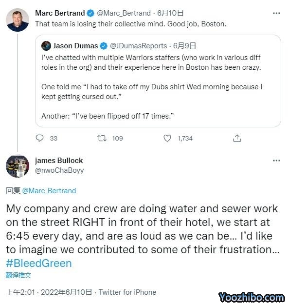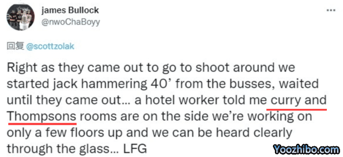 一名推特账号为James Bullock的绿军球迷自曝,他们公司要求他们每天早上6点45分开始在勇士下榻酒店前施工修水管,并且尽可能制造出大的噪音;他还透露库里和汤普森的房间就在他们施工的这一边,他们制造的噪音会穿过玻璃从而影响他们休息。
