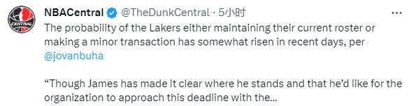 湖人记者Jovan Buha报道,尽管詹姆斯已经把他态度表达得很明确,希望湖人在交易截止日前全力以赴,但消息人士透露,湖人在截止日“零操作”,或者只进行一些边边角角操作的可能性正在上涨。