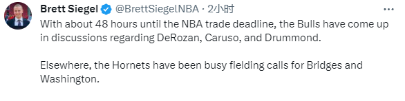 据美记者Brett Siegel报道,如公牛愿在截止日前送走德罗赞,湖人、尼克斯、国王、魔术对其有意。虽然此前有消息称76人可能会是德罗赞的下家,但实际上费城没兴趣在截止日前通过交易得到他。