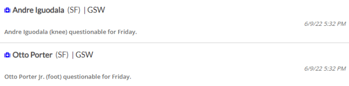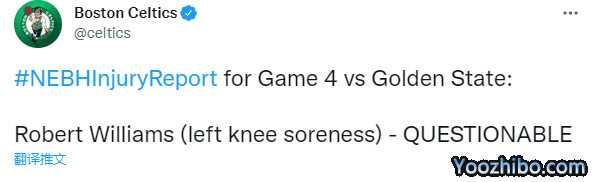 178直播06月10日讯 ,勇士和凯尔特人总决赛G4伤情出炉,绿军全队仅罗威(左膝酸痛)一人被列为出战成疑,勇士队则是伊戈达拉(膝盖伤势)、小奥托-波特(脚部伤势)出战成疑,50%可能性出战;库里(左脚酸痛)大概率出战,此前库里表态他将带伤出战G4,小佩顿已经不在伤病名单上。