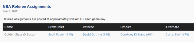 178直播06月09日讯 ,NBA官方公布了总决赛G3的裁判名单,他们分别是48号裁判斯科特-福斯特,16号裁判大卫-古斯里,61号裁判 考特尼-科克兰德,替补裁判是74号裁判柯蒂斯-布莱尔。