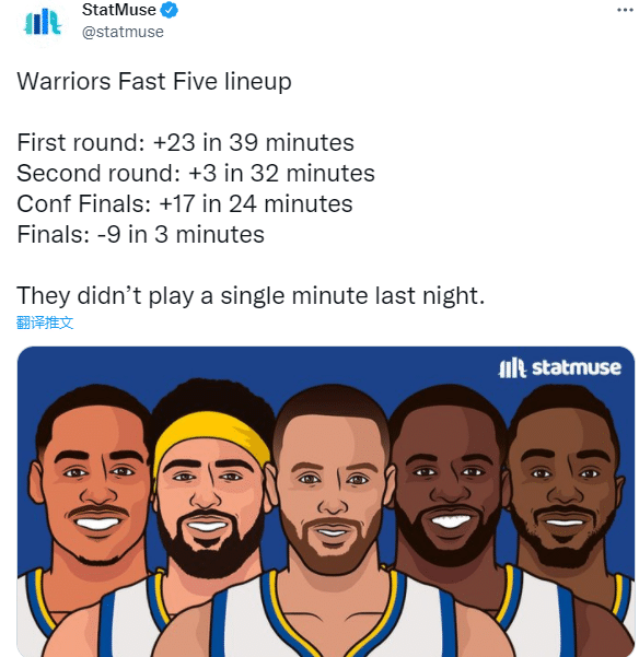 据美媒统计,勇士死亡五小库里+汤普森+格林+普尔+维金斯在总决赛并不好用,总决赛前两战仅仅一起打了3分钟,输了9分;首轮淘汰掘金时勇士五小一起出战39分钟净胜23分,西部半决赛淘汰灰熊时他们一起出战32分钟仅赢3分;西决淘汰独行侠时他们出战24分钟赢17分。