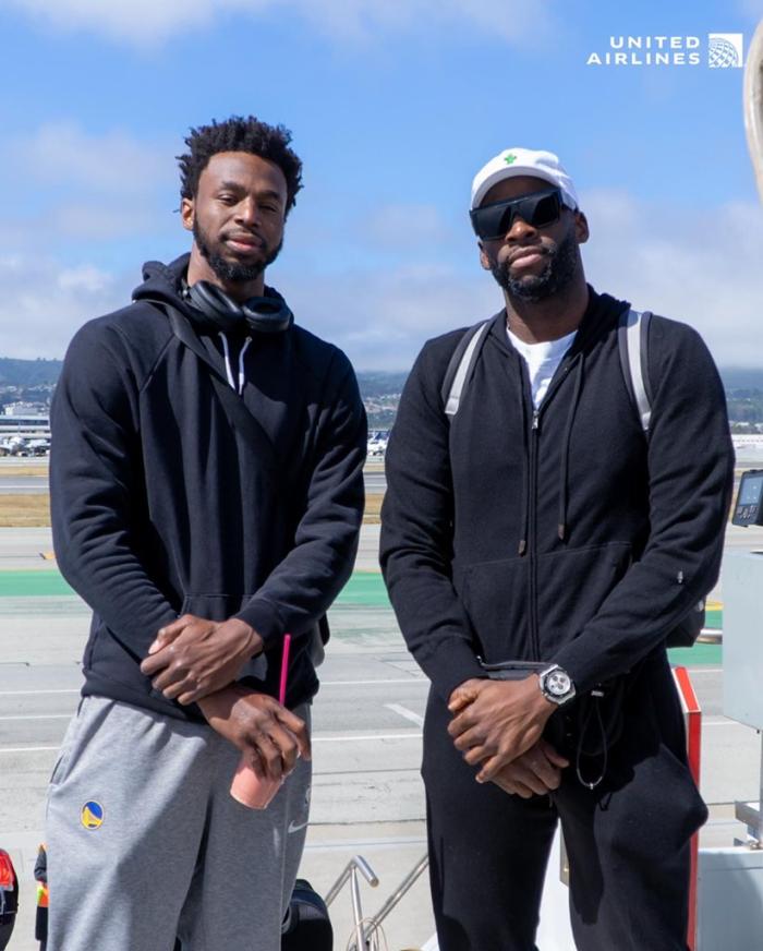 目前勇士众将已经飞往波士顿,登机时维金斯和格林合影。