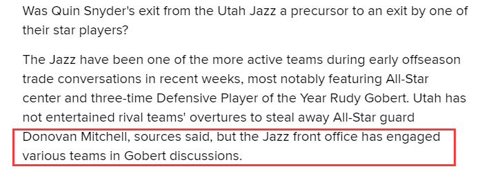 最近几周,爵士是联盟中寻求交易最活跃的球队之一,他们已经把戈贝尔摆上货架,并且与多队商讨交易,这意味着联盟将会发生大交易。
