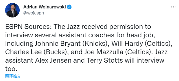 据沃纳罗斯基报道,爵士获得面试前开拓者主帅斯托茨、尼克斯助教约翰尼-布莱恩特、爵士助教艾利克斯-詹森、凯尔特人助教威尔-哈迪、凯尔特人助教乔-马兹拉以及雄鹿助教查尔斯-李的许可,他们都是爵士新帅的候选人。