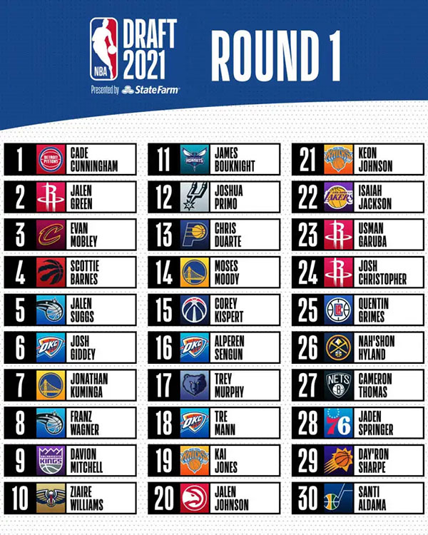 178直播讯 2021年3月30日,NBA公布,2021年NBA选秀大会将在北京时间2021年7月30日在篮网主场巴克莱中心举行,于当日8:00正式开始。NBA还公布了关于2021年NBA选秀大会其它事宜的日期。那么2021年NBA选秀大会首轮被选中的球员有哪些呢?跟随小编一起来了解下吧!
