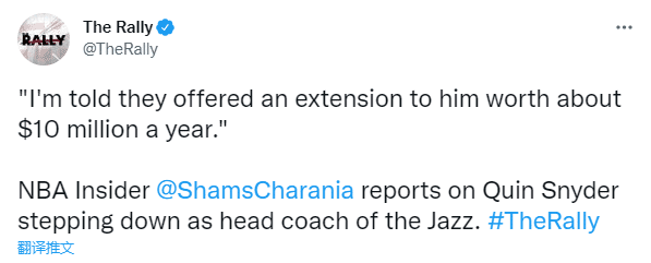 由于种种原因,斯奈德一心只想离队,据名记shams透露,爵士确实想让斯奈德留队,他们曾向后者开出了每年1000万美元的续约合同,但斯奈德仍然决定辞掉主教练一职,很明显,他正在经历其他一些问题。