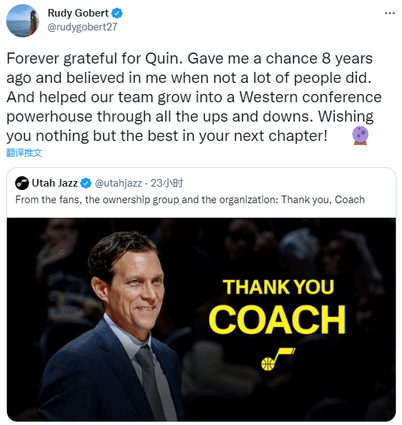 对于主帅离队,戈贝尔更推告别斯奈德,发推写道:我永远都感激斯奈德教练。八年前他给了我一个机会,在很多人都不相信我的时候,只有他相信我。并且他帮助我们的球队在经历了各种跌宕起伏后成长为西部劲旅。祝愿你生活的下一个篇章万事如意!