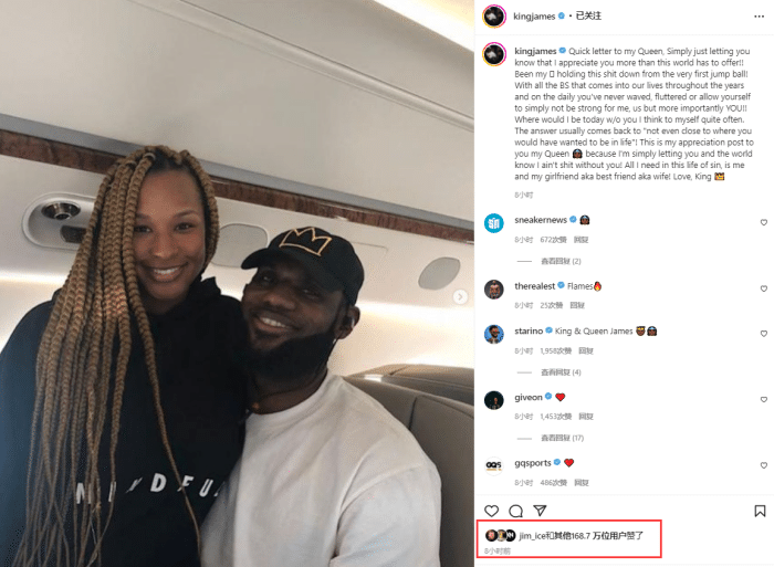 詹姆斯对萨瓦娜的感谢信引热议,将近170万人点赞以及2万多人评价,科勒-卡戴珊留言:国王和王后。