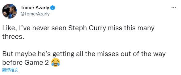 NBA记者Tomer Azarly晒出勇士球星库里备战G2的训练视频,视频中库里在右侧弧顶45度与正面弧顶训练三分球,居然连续打铁不中;该记者发推感叹:每当看到库里连续投丢这么多球时,感觉就很奇怪;不过我从来没有见过库里投丢这么多三分球,也许他要把G2之前把所有该投丢的球都投完。