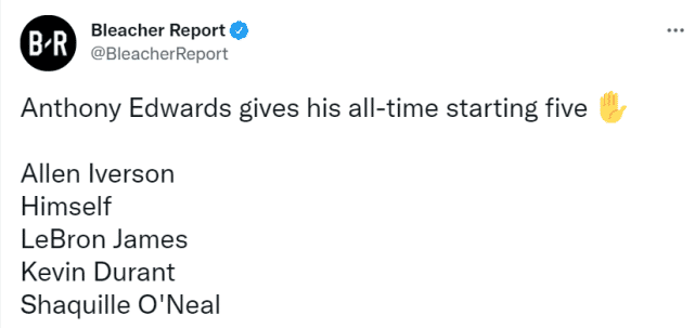 178直播06月04日讯 森林狼的20岁状元爱德华兹总是充满自信,单从他评选历史最佳阵容这件事,就可以看得出来。北京时间6月4日,爱德华兹在采访中公布了自己心中的历史最佳阵容,他的答案是:艾弗森、爱德华兹、詹姆斯、杜兰特和奥尼尔!显然,他用自己顶替了经常出现在这个位置上的“飞人”迈克尔-乔丹。