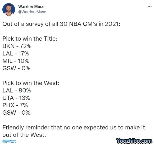 赛季初期,联盟总经理对于哪队能夺冠的投票结果:72%支持篮网,17%支持湖人和10%支持雄鹿,勇士和凯尔特人都是0票被看衰;30位总经理还预测湖人(80%)、爵士(13%)和太阳(7%)三队能冲出西部,勇士同样0票。