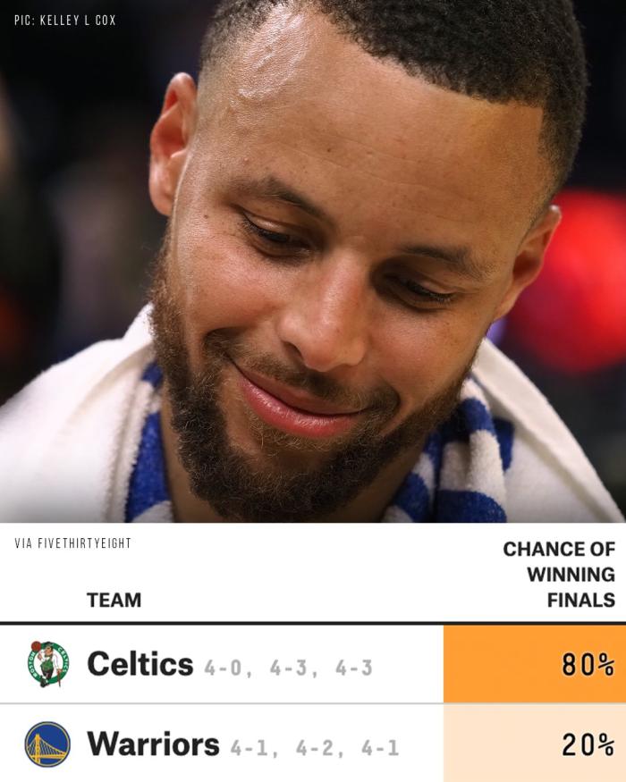知名数据机构FiveThirtyEight今日公布最新的夺冠概率,大数据预测凯尔特人有80%的概率夺冠,勇士则从此前的17%升至20%。