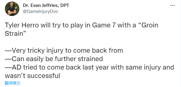 对于希罗带伤复出,医学专家Evan Jeffries表示- 非常棘手的伤病情况,很容易导致腹股沟伤势恶化,去年浓眉试图带着同样的伤病复出,最终没有成功。