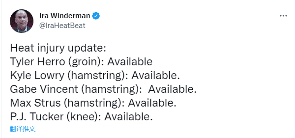 据热火记者Ira WInderman报道,此前被列为出战成疑的洛瑞(腿筋)、希罗(腹股沟)、塔克(膝盖)、斯特鲁斯(腿筋)和文森特(腿筋)均可以出战本场比赛;热火也是全员出战,其中希罗火线带伤复出,为总决赛也是拼了。