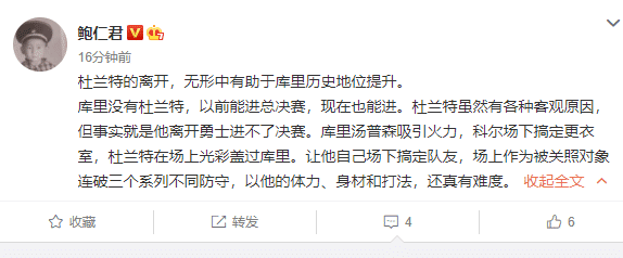 知名篮球记者鲍仁君在社交媒体上点评杜兰特、库里和勇士的时候表示:“杜兰特的离开,无形中有助于库里历史地位提升。库里没有杜兰特,以前能进总决赛,现在也能进。杜兰特虽然有各种客观原因,但事实就是他离开勇士进不了决赛。库里汤普森吸引火力,科尔场下搞定更衣室,杜兰在场上光彩盖过库里。让他自己场下搞定队友,场上作为被关照对象连破三个系列不同防守,以他的体力、身材和打法,还真有难度。”