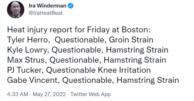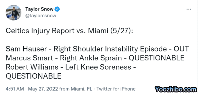 178直播05月27日讯,热火和凯尔特人公布了东决G6的最新伤情。绿军方面,斯马特(右踝扭伤)和罗伯特-威廉姆斯(左膝酸痛)被列为出战成疑,豪瑟(右肩伤病)继续缺阵;热火方面,希罗(腹股沟拉伤)、塔克(膝盖伤病)、洛瑞(腿筋拉伤)、斯特鲁斯(腿筋拉伤)、文森特(腿筋拉伤)都是出战成疑。塔图姆和巴特勒都不在伤病名单上,确定出战G6,但两人都是带伤作战,塔图姆肩膀有问题,巴特勒的膝盖也有伤。