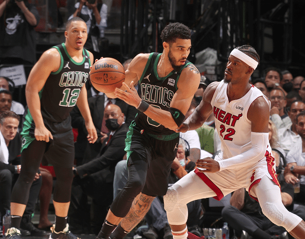 178直播05月26日讯 ,NBA东决天王山凯尔特人击败热火,拿下G5从而系列赛3-2领先夺赛点,斯玛特火线复出,塔图姆20投7中拿到22分12篮板9助攻,上半场9中1仅4分,但下半场18分带队拿下胜利,24岁塔图姆创纪录,仅次于科比成为NBA季后赛第2年轻1500分先生。布朗19投10中拿到25分4篮板,下半场19分以及末节13分,双探花下半场37分以及末节22分打爆热火。