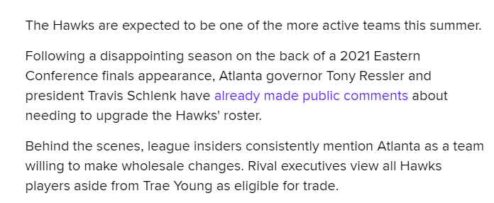 178直播05月25日讯,据露天看台记者Jake Fischer报道,老鹰有望成为今夏在交易市场上最活跃的球队之一;联盟内部人士透露,老鹰是一支愿意进行大规模改变的球队。竞争对手的高管认为,除了特雷-杨之外,老鹰所有的球员都可以被交易。