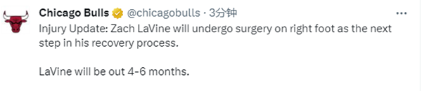 公牛官宣,在与芝加哥公牛队的训练人员和医务人员协商后,拉文和他经纪公司决定对他的右脚进行手术,手术预计在2月6日进行,拉文将缺席4-6个月。如有需要,球队将及时更新最新情况。