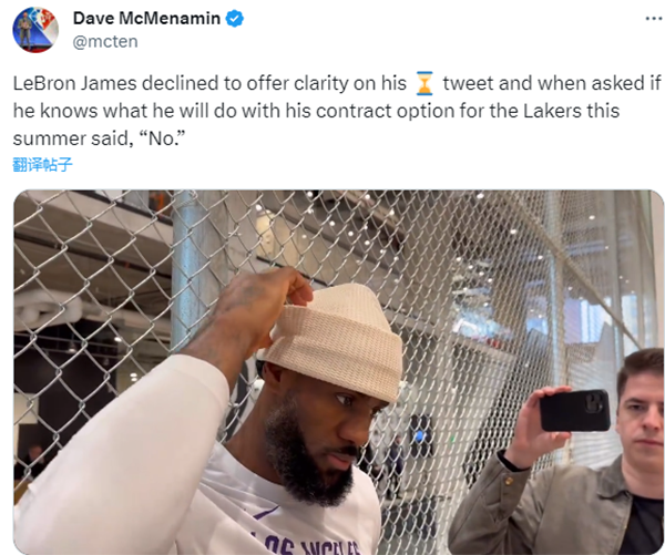 对于此前的沙漏表情,接受采访时,詹姆斯拒绝解释该表情的含义,还表示他不知道自己是否会执行球员选项;目前詹姆斯和湖人下赛季的合同为价值5140万美元的球员选项,他需要在6月30日前决定是否执行球员选项。