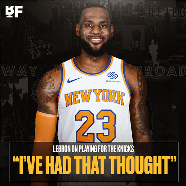 接受采访时,当被问及是否有考虑过加盟尼克斯时,詹姆斯表示:2010年当我身为自由球员,要做出选择时,尼克斯是我曾考虑过的球队之一。所以,我有想过。