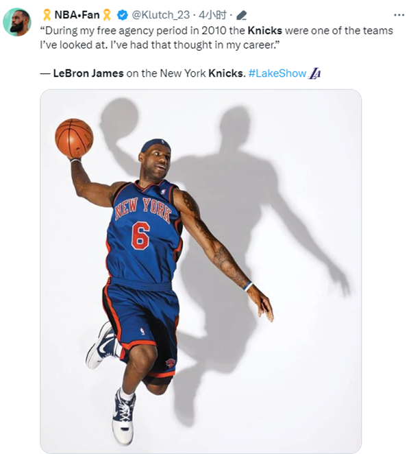 詹姆斯直言曾考虑加盟尼克斯引热议,球迷以及美媒都晒出詹姆斯身穿尼克斯球衣的P照,此前名嘴A-史密斯曾喊话詹姆斯加盟尼克斯,并表示在纽约能让他获得更好的夺冠机会。