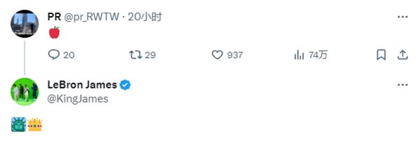 近日詹姆斯多次更新神秘推文令人浮想联翩——3天前,詹姆斯在凌晨2点26分突然发推,仅晒沙漏表情引热议;20个小时前,詹姆斯的一位友人发布了代表纽约(绰号:大苹果城)的苹果表情,詹姆斯回复:自由女神像+皇冠。