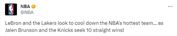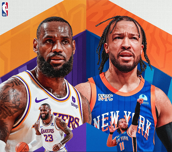 NBA官方晒詹姆斯和布伦森对位的海报为本场比赛预热,发套写道:勒布朗和湖人队希望给 NBA 最炙手可热的球队降降温;杰伦·布伦森和尼克斯则冲击10连胜。