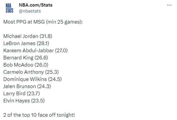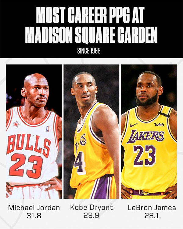 史上在麦迪逊广场花园的场均得分前十(至少出战25场比赛):1、乔丹31.8分;2、詹姆斯28.1分;3、贾巴尔27分;4、伯纳德-金26.6分;5、麦卡杜26分;6、安东尼25.3分;7、威尔金斯24.5分;8、布伦森24.3分;9、拉里-伯德23.7分;10、埃尔文-海耶斯23.5分。