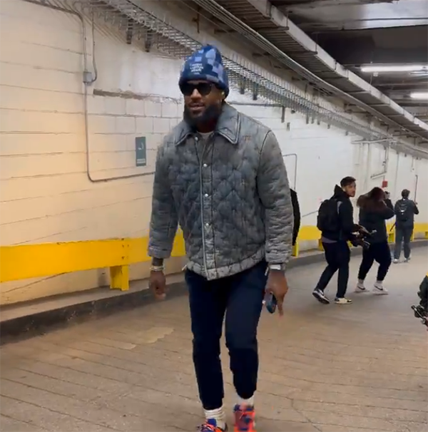 距离湖人和尼克斯比赛开打还剩2个多小时,39岁的詹姆斯包裹严实,身穿紧身裤和加棉外套,戴着墨镜和蓝色帽子,大摇大摆地走进球场,冲着镜头大喊:詹姆斯先生已经抵达麦迪逊广场花园了。