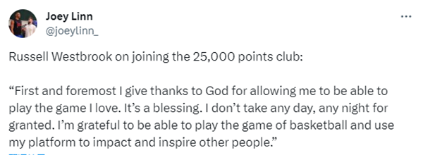 赛后谈到25000分里程碑,威少表示:首先,我要感谢上帝能够让我打我喜欢的比赛,这是一种恩赐,我不认为任何一天、任何一个夜晚都是理所当然的。我很感激能够打篮球,用这个平台去影响和激励更多人。