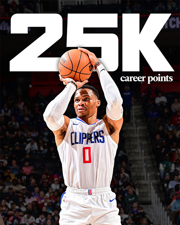 1、威少正式达成25000分里程碑,成为NBA历史上第25位25000分先生
