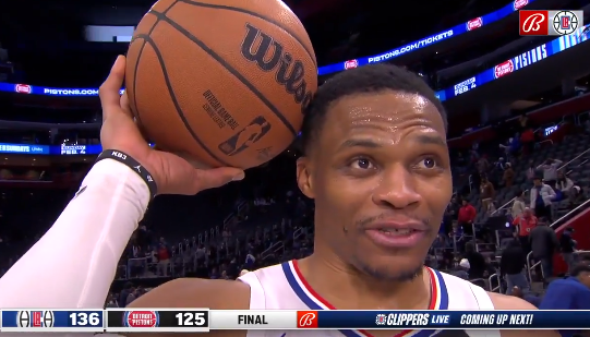 比赛最后时刻,威少达成25000分后下场休息,哈登、小卡等人都祝贺威少,哈登咧嘴大笑,与威少击掌庆祝。赛后威少获得比赛用球。