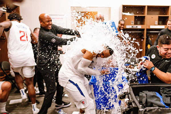 178直播12月03日讯 ,快船客场轻松击败联盟倒数第一的活塞,威少解锁25000分里程碑,赛后快船更衣室泼水狂欢,威少浑身被浇透,队友吓跑以及小卡赤膊大笑。