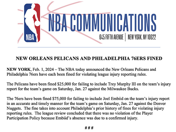 由于此前在对阵掘金的比赛之前,76人未能准确并及时地报告恩比德的比赛状态,被罚款75000美元。NBA官方指出,这笔罚款的额度,是考虑到了76人过往有过类似违反伤病报告的行为。而据联盟调查的结果显示,恩比德并没有违反球员参赛政策,因为恩比德确实是因受伤而缺席了比赛。