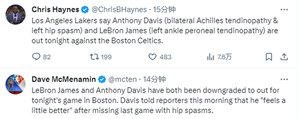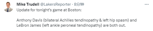 178直播02月02日讯 ,湖人官方更新最新伤情,詹姆斯(左脚踝腓骨肌腱伤势)、安东尼-戴维斯(双侧跟腱伤势、左髋部痉挛)都因伤缺席今天与凯尔特人的黄绿大战。