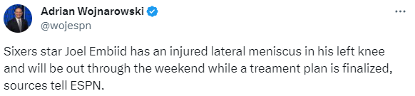 由于意外遭遇膝盖伤病,恩比德暂时离开球队并且提前返回费城接受检查,最新核磁检查结果显示,恩比德的左膝受伤,半月板受伤太不幸。