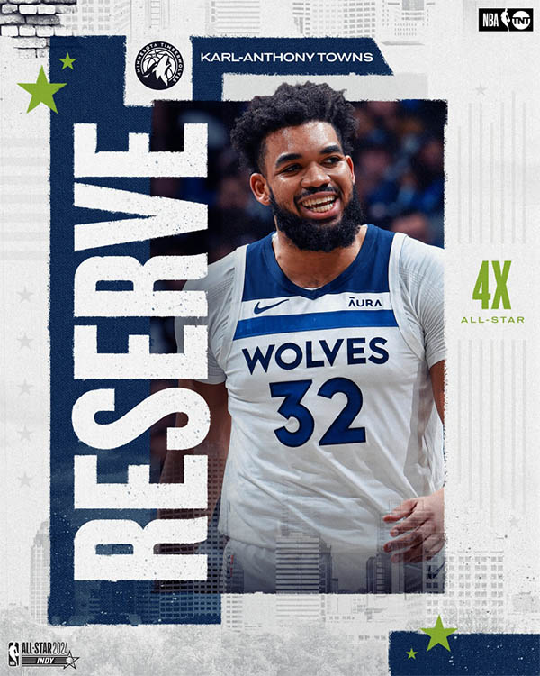 森林狼的唐斯入选西部全明星替补阵容,这是唐斯生涯第4次入选全明星。赛季至今,唐斯场均22.7分8.7篮板3.1助攻,投篮命中率52.2%,三分命中率44.3%。