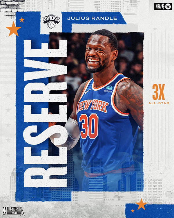 尼克斯的兰德尔入选东部全明星替补阵容。这是兰德尔生涯第3次入选全明星。赛季至今,兰德尔场均24分9.2篮板5助攻,投篮命中率47.2%,三分命中率31.1%。