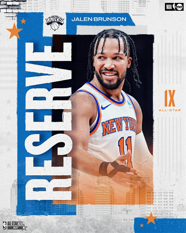 东部全明星替补尼克斯的布伦森入选东部全明星替补阵容。这是布伦森生涯首次入选全明星。赛季至今,布伦森场均26.8分3.8篮板6.5助攻,投篮命中率48%,三分命中率42.2%。