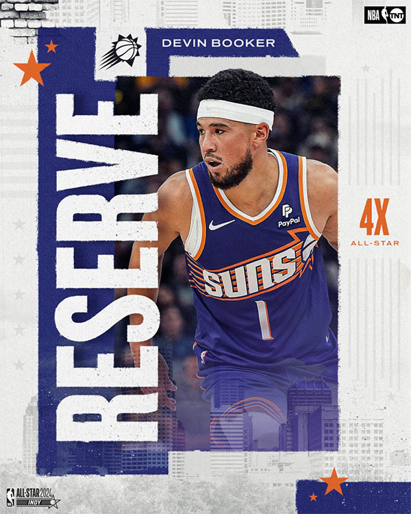 太阳的布克入选西部全明星替补阵容。这是布克生涯第4次入选全明星。赛季至今,布克场均28.3分4.9篮板7.3助攻,投篮命中率50.2%,三分命中率38.8%。