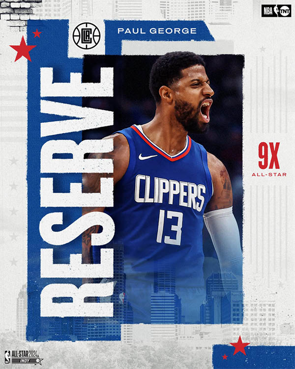 快船的乔治入选西部全明星替补阵容。这是乔治生涯第9次入选全明星。赛季至今,乔治场均23分5.5篮板3.5助攻1.6抢断,投篮命中率46.3%,三分命中率41.2%。