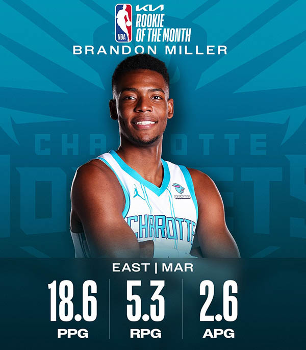 文班亚马连续三个月夺得西部月最佳新秀,成为邓肯之后马刺队史第一位获此殊荣的新秀球员;米勒则是连续三个月获得东部月最佳新秀。