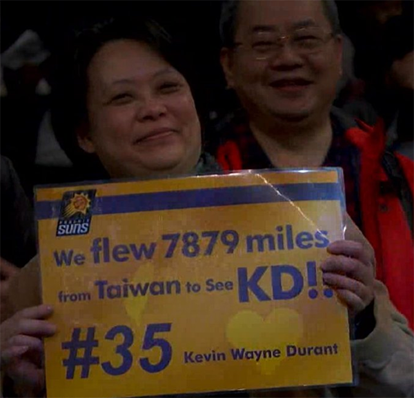 这位球迷从中国台湾来到纽约布鲁克林,只为看杜兰特重返篮网主场比赛,她的标语上面写着自己飞行了7879英里,折合12680公里,上万公里的飞行,来到现场观看杜兰特对阵旧主篮网。