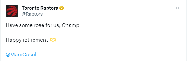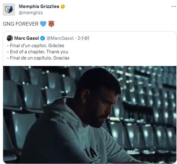 小加索尔正式宣布退役,猛龙官推晒小加抱着总冠军奖杯的定妆照,配文写道:祝你退役幸福。灰熊官推直言小加永远都是灰熊人。