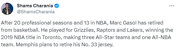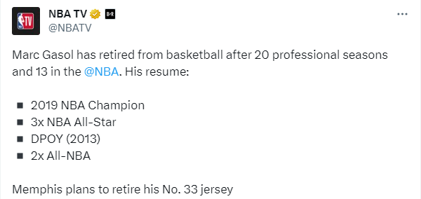 178直播02月01日讯 ,西班牙篮坛巨星马克-加索尔正式宣布退役,结束20年职业生涯,13年NBA生涯先后为灰熊、猛龙和湖人三队效力,3次入选全明星、1次夺得年度最佳防守球员以及2019年在猛龙实现冠军梦;据报道,灰熊计划退役他的33号球衣。