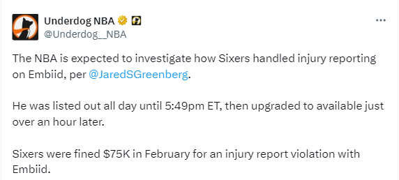 恩比德的复出状态反复不定,76人因此被联盟调查,据美记Jared Greenberg报道,NBA预计将调查76人如何处理恩比德在赛前伤病名单一事——本来恩比德一直被列为缺席,直到今天上午5点49分他还是缺战状态,赛前一个多小时后,恩比德的状态从出战成疑升级为可以出战。