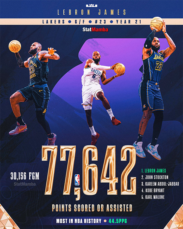 据统计,詹姆斯已经成为NBA历史上得分以及助攻得分总和最多的球员,这一数字高达77642分为历史之最;约翰-斯托克顿、贾巴尔、科比和卡尔-马龙分列历史第2-5位。
