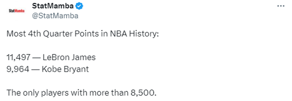职业生涯至今,詹姆斯已经在末节得到11497分,早已超越科比(末节9964分)成为NBA历史末节得分王;NBA史上仅仅只有他们两人的末节得分超过8500分,其中詹姆斯末节得分更是突破10000分,如此纪录同样是历史唯一。